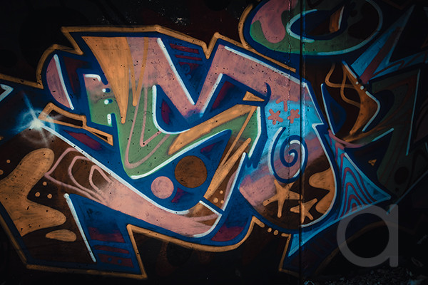 - Caption: Graffiti letteriing pops off the cement given the black background. I have a running Graffiti collection here, I tend to search out a towns Graffiti for photography.
